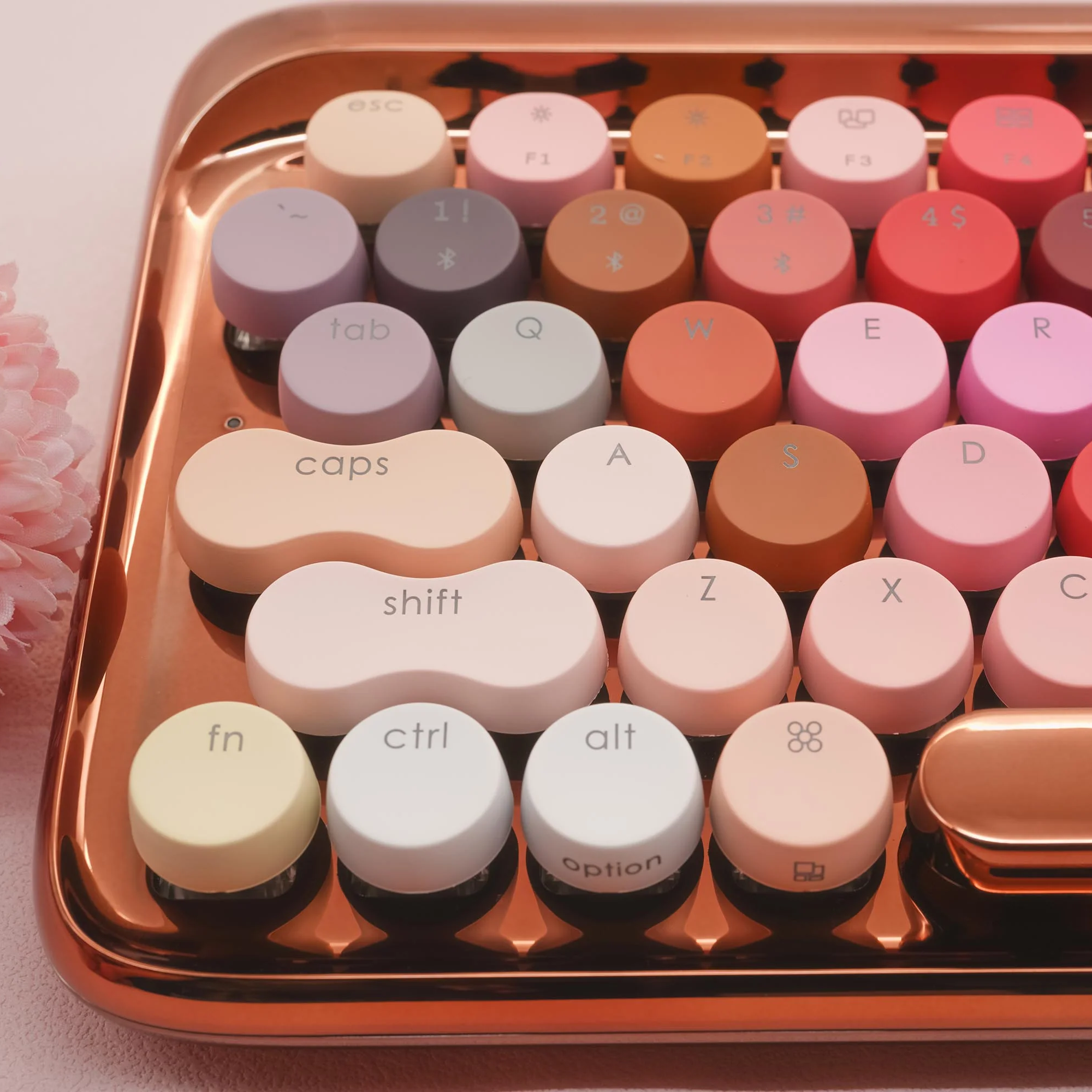 LOFREE Blossom это 79 клавиш с 79 различными цветами косметики - лучший подарок для вашей девушки! Яркие колпачки клавиш и розово-золотой фон клавиатуры идеально сочетаются в прекрасном произведении искусства.