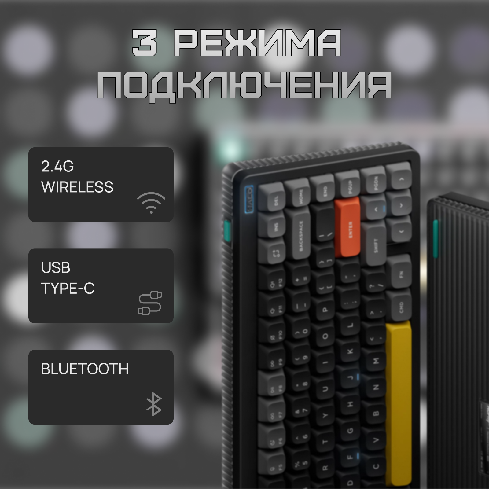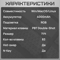 | Комплектация | 1 x клавиатура Halo75 V2 1 x кабель 1,5 м (59 дюймов) 1 x приемник 2,4G 1 x съемник клавиш/переключателей 6 x дополнительных клавишных колпачков 3 x дополнительных переключателя 1 x набор наклеек 1 x краткое руководство 1 x вопросы и ответы |