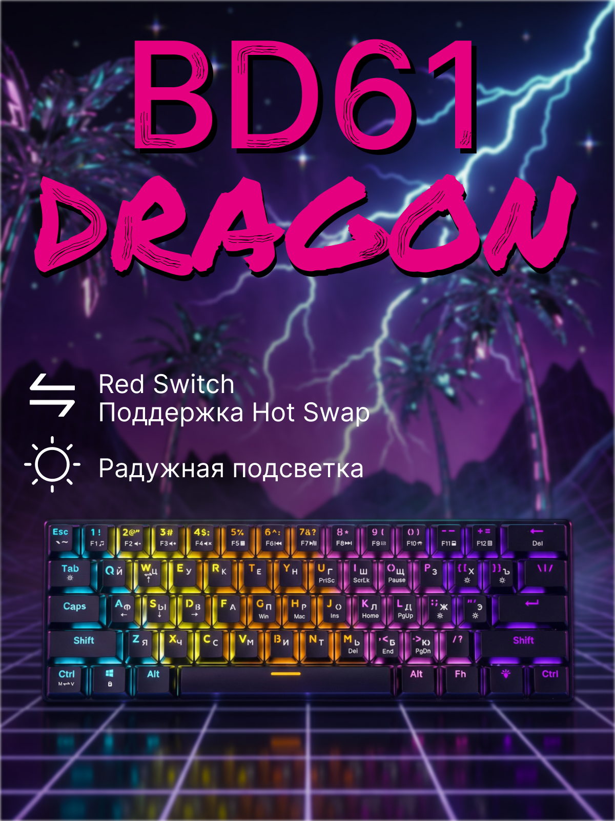 Проводная игровая клавиатура CyberLunx BD61 Черная, механическая, радужная подсветка, Red Switch: сравнение цен, характеристики, фото, актуальное наличие и цены.