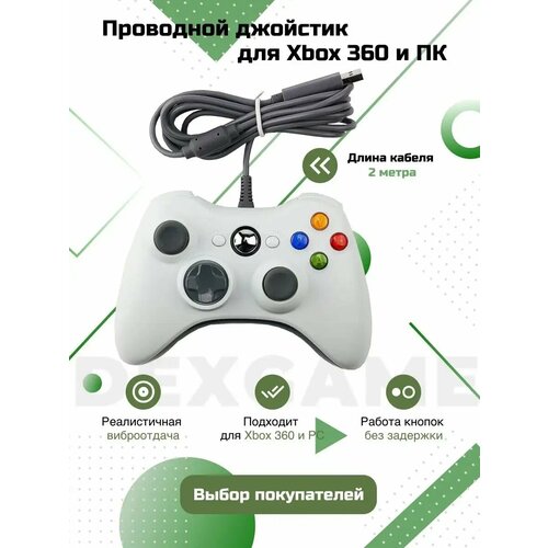 Джойстик проводной — идеальный подарок любителю компьютерных игр, который позволит с комфортом и максимальной точностью от контроля наслаждаться играми. Джойстик xbox 360 Wireless Controller с проводом можно не переживать, что кончится заряд и придется прекратить играть. Дизайн геймпада выполнен в современном стиле, есть черный и белый цвета. Он обладает эргономичной формой и признанной как самая эргономичная и удобная среди всех конкурентов , которая обеспечивает максимальный комфорт для игрока при длительных игровых сессиях. Наш контроллер подходит для компьютеров, игровых консолей Microsoft Xbox 360 (Для всех версий) (иксбокс). У нас представлены геймпады черного и белого цвета. В комплекте идет геймпад с проводом 2 метра и инструкция. Товар приходит в фирменной коробке от изготовителя, что особенно хорошо, если вы покупаете наш джойстик для подарка парню, мужу, другу или коллеге. Также имеется разъем для наушников 2,5 мм. Для подключения достаточно воткнуть провод от джойстика в USB разъем устройства и включить геймпад, зажав кнопку «Conect» (большая металлическая кнопка, находится посередине). Если вы хотите использовать гаджет с телефоном системы андроид, то необходимо воспользоваться OTG переходником (Не поставляется в комплекте). Gamepad проводной оснащен кабелем длиной 2 м, что достаточно для комфортной игры на большом расстоянии от экрана. Благодаря проводному подключению, эти геймпады обеспечивают более стабильную и надежную связь с вашим устройством, что гарантирует высокую скорость реакции и минимальную задержку в игровом процессе. Насладитесь комфортной и захватывающей игрой с помощью продукции бренда DEX.
