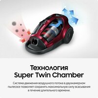 Если предмоторный фильтр забит пылью, воздушный поток через пылесос уменьшится, а вместе с ним уменьшится и всасывающая сила. Система движения воздушного потока в двухкамерном пылесосе с технологией Super Twin Chamber такова, что она позволяет сохранять максимальную силу всасывания в течение длительного времени. Технология Super Twin Chamber позволяет продлить силу всасывания на 20% по сравнению с другими пылесосами Samsung.