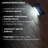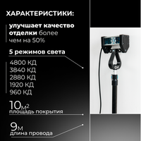 Самая топовая и яркая проявочная лампа маляра. Предназначена для отделочных работ и контроля качества поверхности. Проявочный светильник позволяет подготавливать стены по международным стандартам Q3 и Q4. Помимо ступенчатого режима переключения, есть плавный режим для подбора яркости свечения. Этим мы решили проблему выявления проблемных зон малой площади. Например, вам необходимо сделать зону у лестницы, ванную, туалет. Стена короткая и отражённый свет от противоположной стены при большой яркости скрывает тени от неровностей. С этой лампой теперь вы можете настроить яркость такую, какая вам нужна конкретно здесь и сейчас.