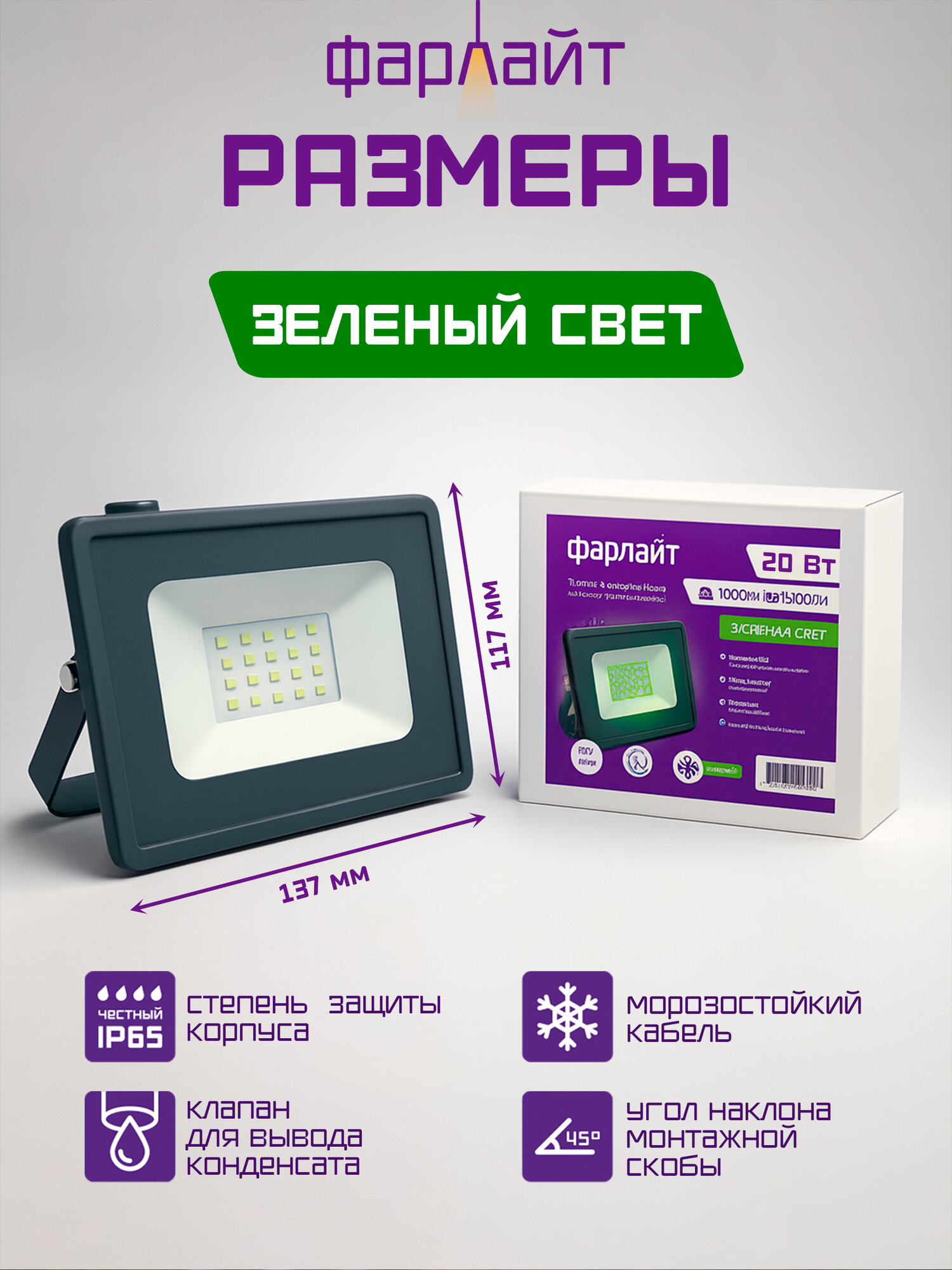 | Дополнительная информация | 45⁰ угол наклона монтажной скобы, надежный теплоотвод, вывод сальника снизу, морозостойкий кабель, умный драйвер, литой алюминиевый корпус, клапан для вывода конденсата, зеленый свет, степень защиты IP65 |
