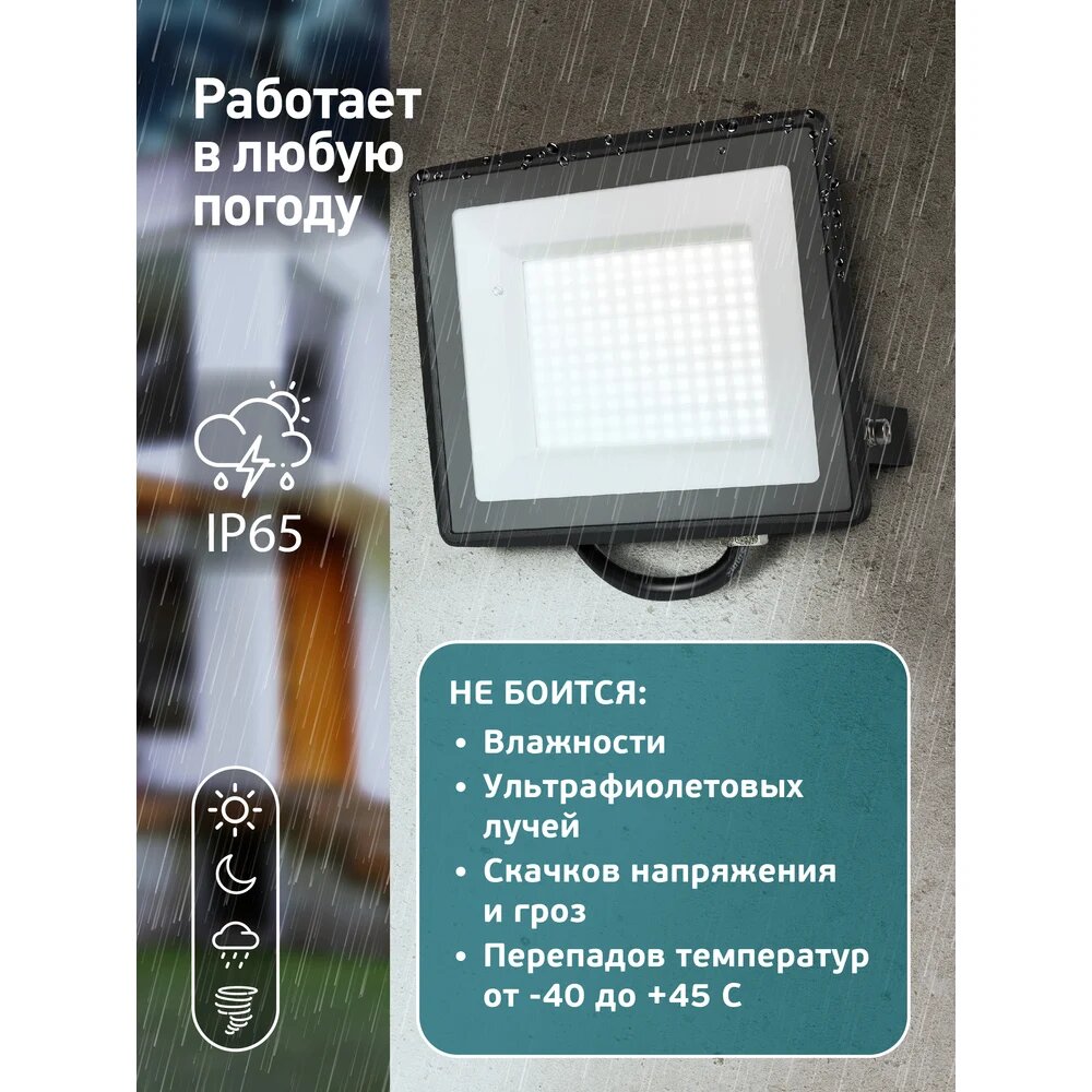 Прожектор светодиодный уличный Эра LPR-024-100 предназначен для освещения улиц, дворов, парковок, фасадов, деревьев. Он обеспечивает яркую и равномерную подсветку, подходящую для любых наружных условий. Светодиодная технология позволяет значительно снизить энергопотребление по сравнению с традиционными источниками света. Корпус из алюминия обеспечивает долговечность устройства и защиту от механических воздействий. Компактные размеры и универсальное крепление позволяют легко устанавливать прожектор на любую поверхность. Особенности: мощность — 100 Вт; степень защиты IP65 обеспечивает эксплуатацию в сложных погодных условиях, включая дождь, снег и пыль; цветовая температура — 6500К; дает нейтральный белый свет; срок службы составляет 10 лет; не требует обслуживания; не боится влаги, ультрафиолетовых лучей, скачков напряжения, перепадов температуры. Мощность (Вт): 100 Напряжение (В): 220-240 Цвет освещения: Нейтральный белый Температура цвета (в K): 6500 Световой поток (Лм): 8000 Источник питания: Сетевое питание Степень защиты (IP): IP65 Функции: Отсутствует Тип продукта: Прожектор светодиодный Тип цоколя: Светодиодный (LED) Максимальная температура применения (°C): 40 Минимальная температура применения (°C): -45.0 Ширина (см): 16.5 Высота (см): 4 Глубина (см): 17 Вес нетто (кг): 0.538 Цветовая палитра: Черный Основной материал: Алюминий Особенности продукта: Водостойкий Устройство управления: Настенный выключатель Пульт ДУ: Нет Модель продукта: LPR-024-100