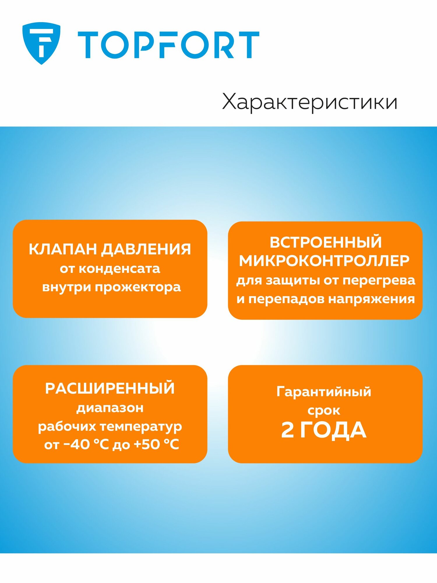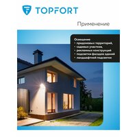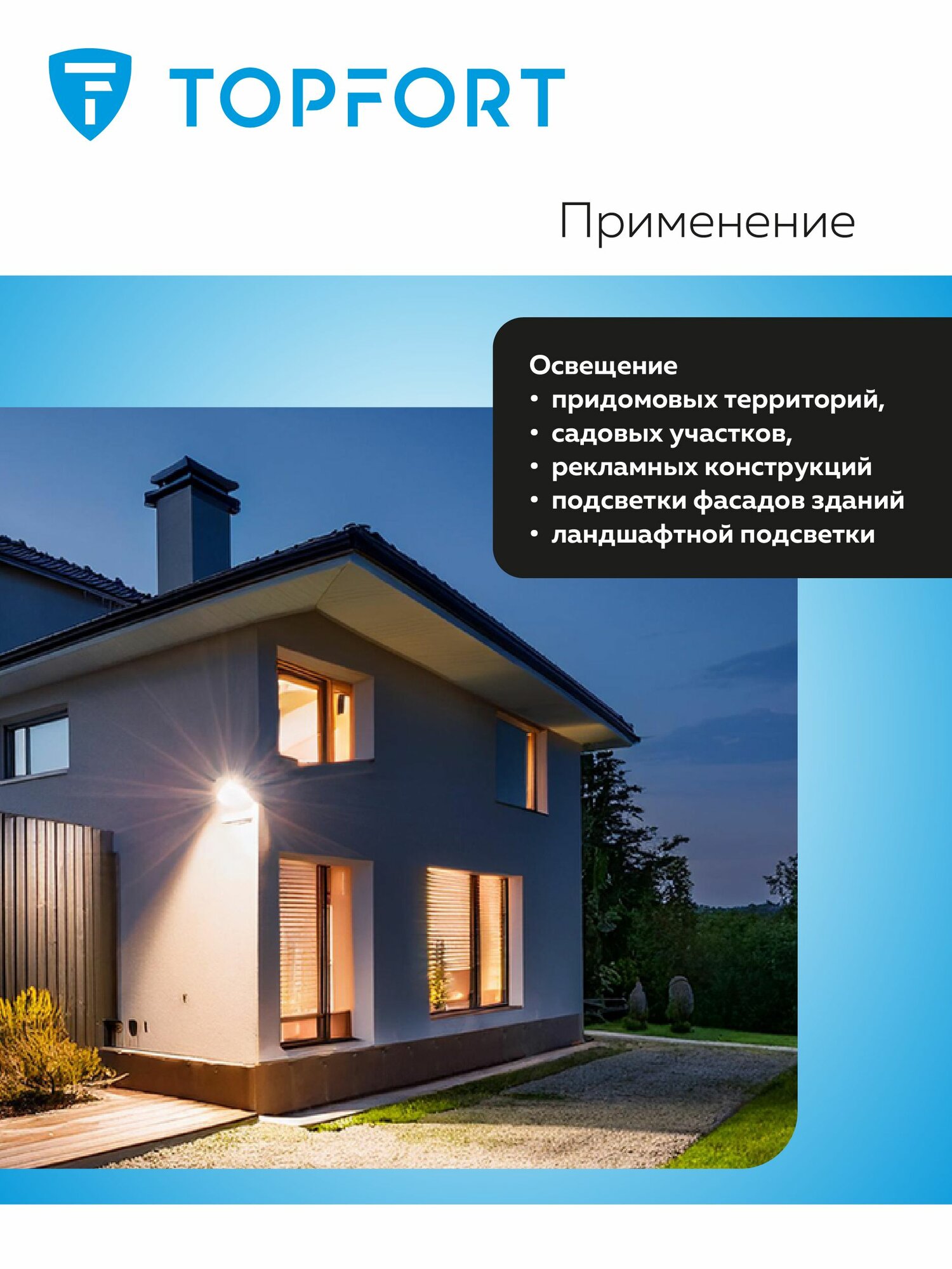 Светодиодный прожектор TOPFORT предназначен для эффективного наружного освещения площадей, садовых участков и придомовых территорий, рекламных конструкций, архитектурной подсветки фасадов зданий, формирования ландшафтной подсветки. Уличный прожектор прекрасно подходит для освещения внешних территорий, фасадов зданий, парковок, спортивных и детских площадок и других открытых пространств, где требуется качественное и эффективное освещение. Холодный белый свет распределяется без резких теней и бликов, создавая приятную атмосферу как для отдыха на открытом воздухе с семьей, так и для рабочей деятельности на территориях домовладения или загородных участков. Устройство имеет срок службы, достигающий 40000 часов эксплуатации. Таким образом, потребитель получает долгосрочное решение для своих нужд. Угол светового пучка равен 120°, что делает освещение обширным и равномерным. Дополнительная защита от внешних воздействий обеспечивается степенью защиты IP65. Это значит, что прожектор устойчив к попаданию воды и пыли, что идеально подходит для уличного использования.
