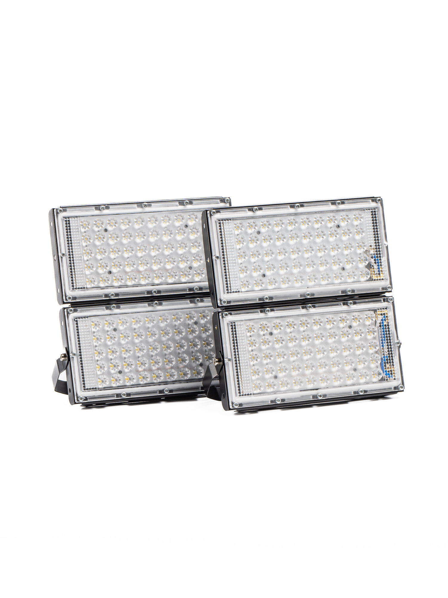 Прожектор оснащен двумя мощными светодиодными лампами по 100 Вт каждая, что обеспечивает яркое и равномерное освещение. Цветовая температура света составляет 6500K, что соответствует холодному белому свету.