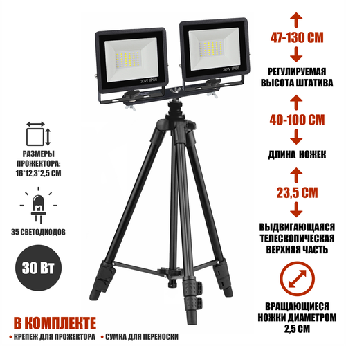 Прожекторы светодиодные 30Вт, 2 шт, на штативе строительном 8810-PRJ-PL2V элевационном представляют собой комплект осветительного оборудования, который идеально подходит для различных строительных и ремонтных работ, а также для других видов деятельности, требующих яркого и равномерного освещения. Каждый прожектор оснащен мощными светодиодными лампами, мощность его 30Вт, что обеспечивает высокую яркость освещения и длительный срок службы. Штатив строительный позволяет удобно и надежно установить прожекторы на нужной высоте и направить свет в нужном направлении. Штатив с прожекторами и креплением обладает устойчивой конструкцией и легкостью в установке, обеспечивает возможность регулировки высоты прожекторов в пределах определенного диапазона, что делает его удобным для работы в различных условиях. Строительные лампы на стойке - надежное и эффективное решение для освещения рабочей зоны и обеспечения комфортных условий труда.