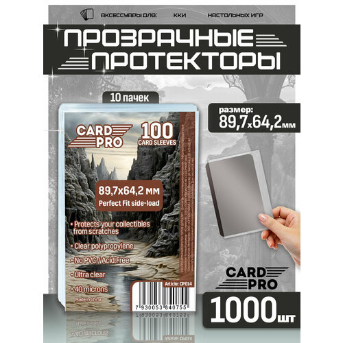 10 упаковок из 100 прозрачных протекторов Card-Pro для карт. Абсолютно прозрачные протекторы размером 64,2х89,7 мм вмещают в себя карточки шириной до 64 мм и высотой до 89 мм включительно. Толщина стенки протектора - 40 микрон (микрометров). Боковая загрузка карт. Изготовлены из 100% полипропилена без использования ПВХ.