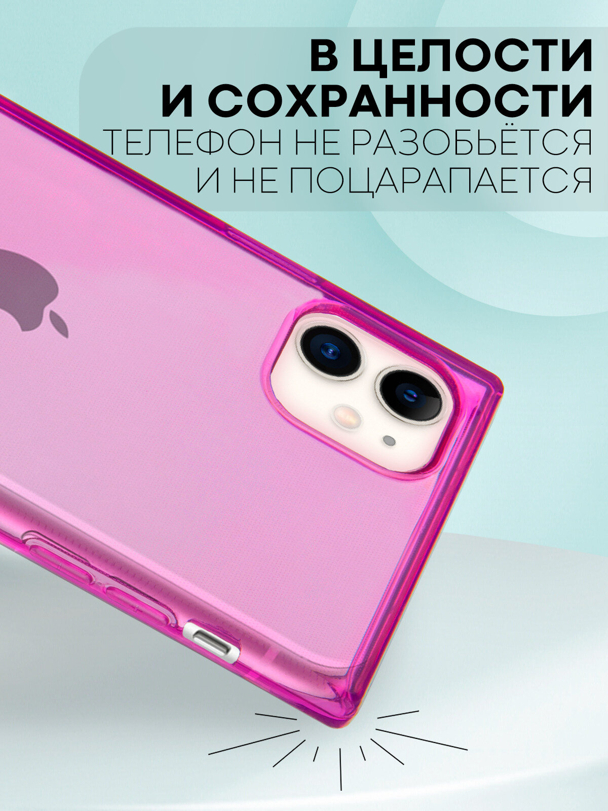 У этого чехла непривычная форма: прямоугольные грани создают ощущение, что телефон вморожен в глыбу льда. Этот строгий силуэт вкупе с прозрачностью создаёт ощущение чистоты, ни на гран не скрывая красоты самого iPhone 11. Используйте такой чехол с квадратными гранями, чтобы удивить окружающих и произвести впечатление на них, ведь больше ни у кого такого чехла не будет. Кейс сделан из термополиуретана (TPU): это упругий гибкий материал, поэтому он будет амортизировать при ударах и защищать от царапин. Чехол немного выступает над дисплеем, чтобы дисплей реже соприкасался с поверхностью стола и другими вредными для него объектами. Сзади вокруг модуля камер вы увидите дополнительный бортик: он защищает камеры, чтобы они ничего не касались, а при падении удар приходился не на них, а на чехол. Силиконовый бампер сделан специально для Эпл Афона 11: его вырезы и кнопки в точности соответствуют всем кнопкам, вырезам и датчикам на смартфоне.
