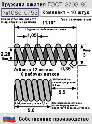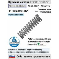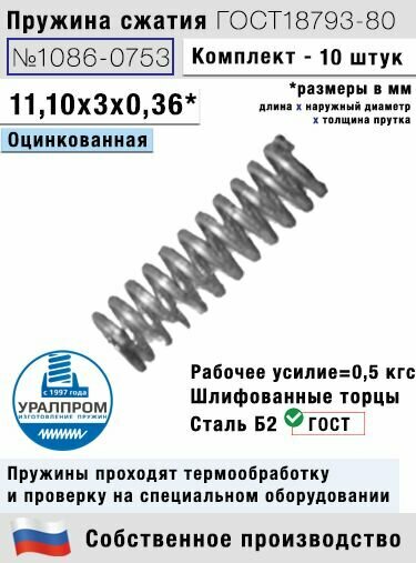 Пружина сжатия 1086-0753, L 11,10 мм; d 0,36 мм; D 3 мм ГОСТ 18793-80 (комплект 10 штук): сравнение цен, характеристики, фото, актуальное наличие и цены.
