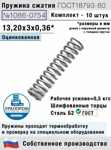 Пружина сжатия 1086-0754, L 13,20 мм; d 0,36 мм; D 3 мм ГОСТ 18793-80 (комплект 10 штук): сравнение цен, характеристики, фото, актуальное наличие и цены.