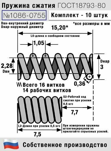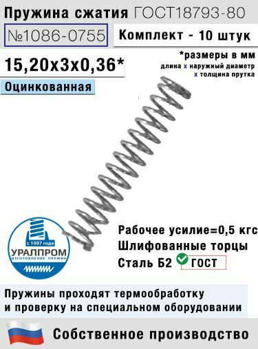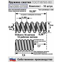 Пружина сжатия 1086-0755, L 15,20 мм; d 0,36 мм; D 3 мм ГОСТ 18793-80 (комплект 10 штук): сравнение цен, характеристики, фото, актуальное наличие и цены.