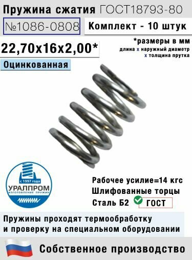 Купить Пружина сжатия 1086-0808, L 22,70 мм; d 2,00 мм; D 16 мм ГОСТ 18793-80 (комплект 10 штук) с доставкой по всей России. Пружина сжатия 1086-0808, L 22,70 мм; d 2,00 мм; D 16 мм ГОСТ 18793-80 (комплект 10 штук): сравнение цен, характеристики, фото, актуальное наличие и цены.