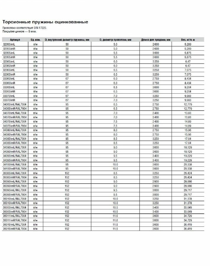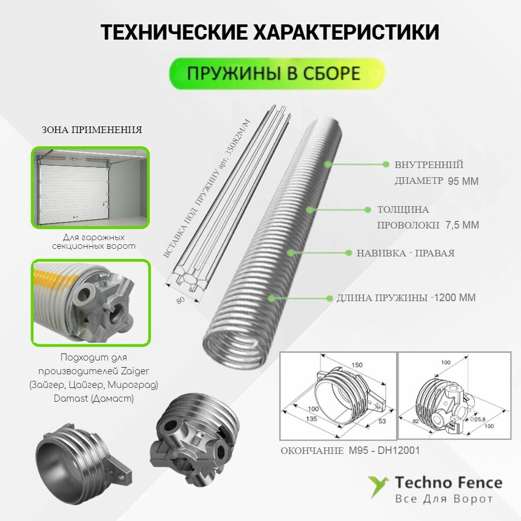 Пружина в сборе с окончаниями для секционных ворот DoorHan 95-7,5 правая навивка, длина 1200 мм (34075/mR/RAL7004) - 1 шт. В пружину в сборе входит: торсионная пружина 95-7,5 правая навивка, (34075/mR/RAL7004) Окончание торсионной пружины M95, DH12001 Вставка под пружину 95 модифицированная, 35082M/M Длина пружины в названии указана без окончаний. Производитель DoorHan(ДорХан). Используется в секционных гаражных воротах с торсионным механизмом DoorHan(ДорХан), Zaiger (Зайгер, Цайгер, Мироград), Damast (Дамаст). Для улучшения механических свойств, пружины DoorHan проходят дробеструйную обработку и окрашиваются антифрикционным порошковым покрытием для защиты от коррозии. Специальное покрытие уменьшает силу трения витков пружины, что продлевает срок эксплуатации. Характеристики: Оцинкованная + окрашенная в серый цвет. Вес одного п/м, кг — 13,83 Внутренний диаметр пружины, мм — 95 Диаметр проволоки, мм — 7,5 Срок эксплуатации 25 000 циклов(открытие+закрытие). Длина измеряется в расслабленном состоянии (натянутая пружина имеет несколько большую длину); Диаметр проволоки можно замерить обычным штангенциркулем, либо более простым способом: необходимо измерить 10 витков и полученное расстояние разделить на 10, например, если измеренное расстояние получилось 65 мм, значит диаметр проволоки у этой пружины – 67-7,0 мм. Будьте внимательны, при замере диаметра проволоки пружины, т. к. пружины изготавливаются из проволоки, с шагом 0,5 мм. Чтобы определить в какую сторону у вас навивка у лопнувшей пружины, просим обязательно внимательно изучить фотографии в карточке товара со схематичным отображением определения навивки.