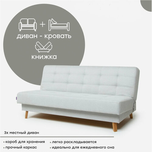 Диван-кровать выполнен в светло-сером цвете, который легко впишется в любой интерьер. Обивка из текстиля в виде ткани рогожка приятна на ощупь и легка в уходе.