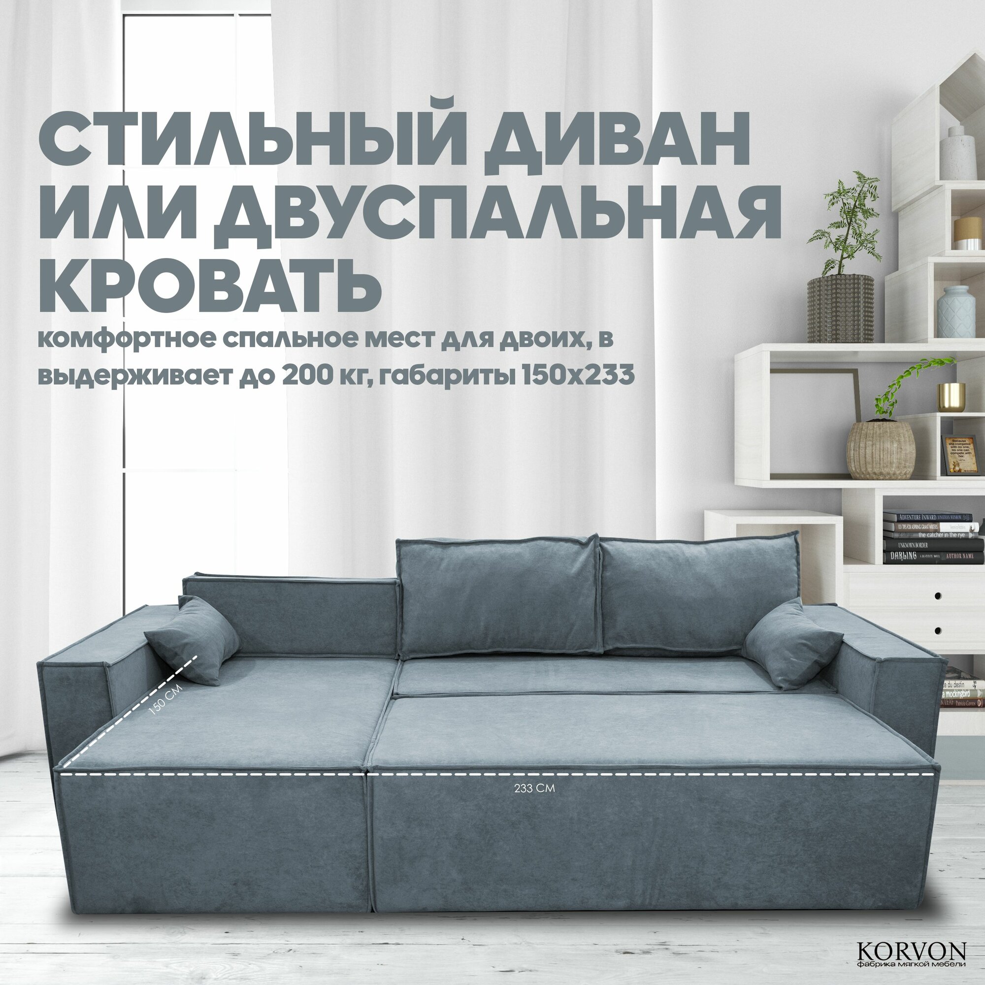 Этот двухспальный диван от KORVON - это не просто софа, а полноценное спальное место. Его можно использовать как угловой вариант, так и расположить прямо у стены. Система "еврокнижка" обеспечивает быстрое и легкое трансформирование из дивана в кровать. Велюровая обивка приятна на ощупь и добавляет элегантности интерьеру комнаты. Это двухместная модель с выкатным механизмом будет функциональным решением для любого помещения: будь то гостиная или детская комната.