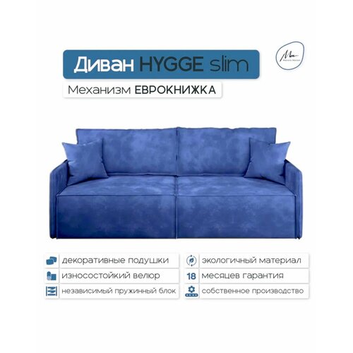 Купить Прямой диван Manons Maison Hygge Slim, раскладной механизм Еврокнижка, Велюр синий, 218х100х86 см с доставкой по всей России.