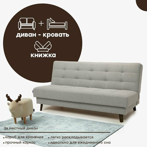 Диван-кровать выполнен в светло-сером цвете, который легко впишется в любой интерьер. Обивка из текстиля в виде ткани рогожка приятна на ощупь и легка в уходе.