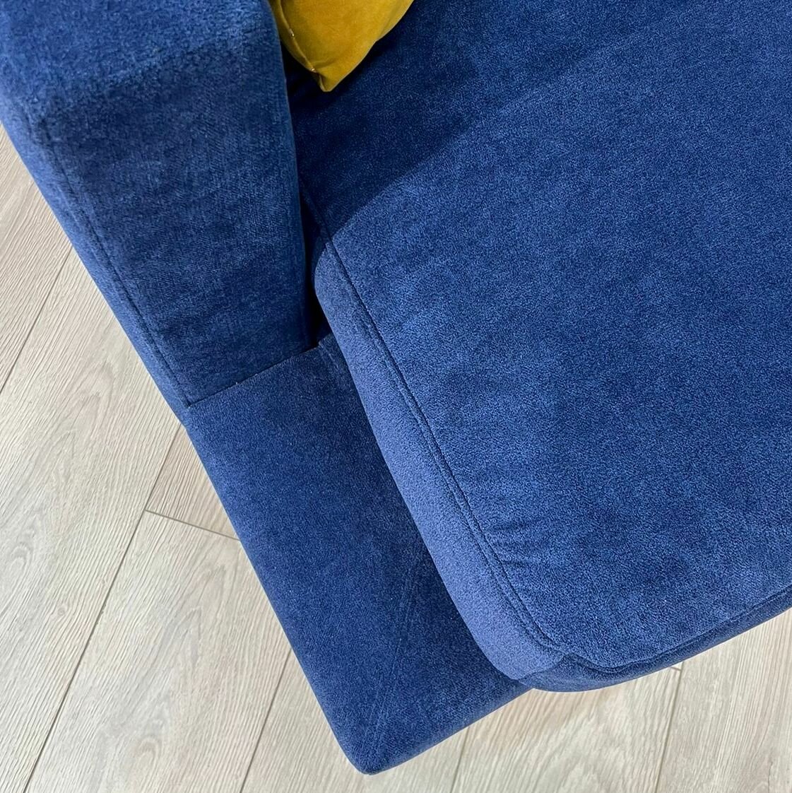 Прямой диван из премиальной линейки выполнен в современном стиле. Приспинные подушки и сиденье с эффектом мемори, очень мягкие и комфортные для сидения. Подушки съемные . Ткань обивки микрошенилл , глубокого синего цвета. Основание имеет необычную форму, его углы можно функционально использовать. Тонки ножки выполнены из металла, и делают диван визуально парящим в воздухе