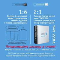Наша сверхмощная обратноосмотическая мембрана atoll 800 TWIST производит в минуту более 2-х литров чистой питьевой воды.