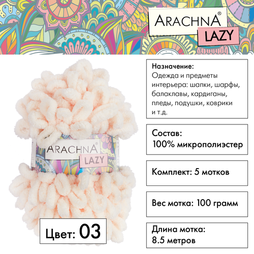 Пряжа ARACHNA LAZY 100% микрополиэстер 5 шт. х 100 г 8.5 м N03 сливочный Пряжа ARACHNA "LAZY" используется для вязания различных аксессуаров и предметов интерьера. Фантазийная, плюшевая пряжа. Нить выглядит как ряд петель. Благодаря объемной нити всего за несколько часов можно связать мягкие и комфортные пледы, покрывала, шапки, снуды, кардиганы и игрушки. Для вязания петельной пряжи не требуются спицы или крючок, поскольку пряжа вяжется руками. Уход за готовым изделием: ручная стирка t-30, не гладить, щадящий режим химчистки, не отбеливать, не сушить в барабанной сушилке. Для достижения наилучшего результата в одной работе рекомендуется использовать нитки из одной партии "lot", который указан на этикетке. Тип пряжи: Фантазийная Цветовая палитра: классические цвета - белый / черный, бежевый, серый, голубой, розовый и др, цвета из актуального тренда - сливочный, античная роза, джинсовый, оливковый и др. В полотне 10х10 см - 4 ряда по 6 петель - лицевая гладь Толщина нити: толстая Длина нити: 8.5 м Вес: 100 г Состав: 100 % микрополиэстер Примечание: цвет товара может отличаться от цвета фото