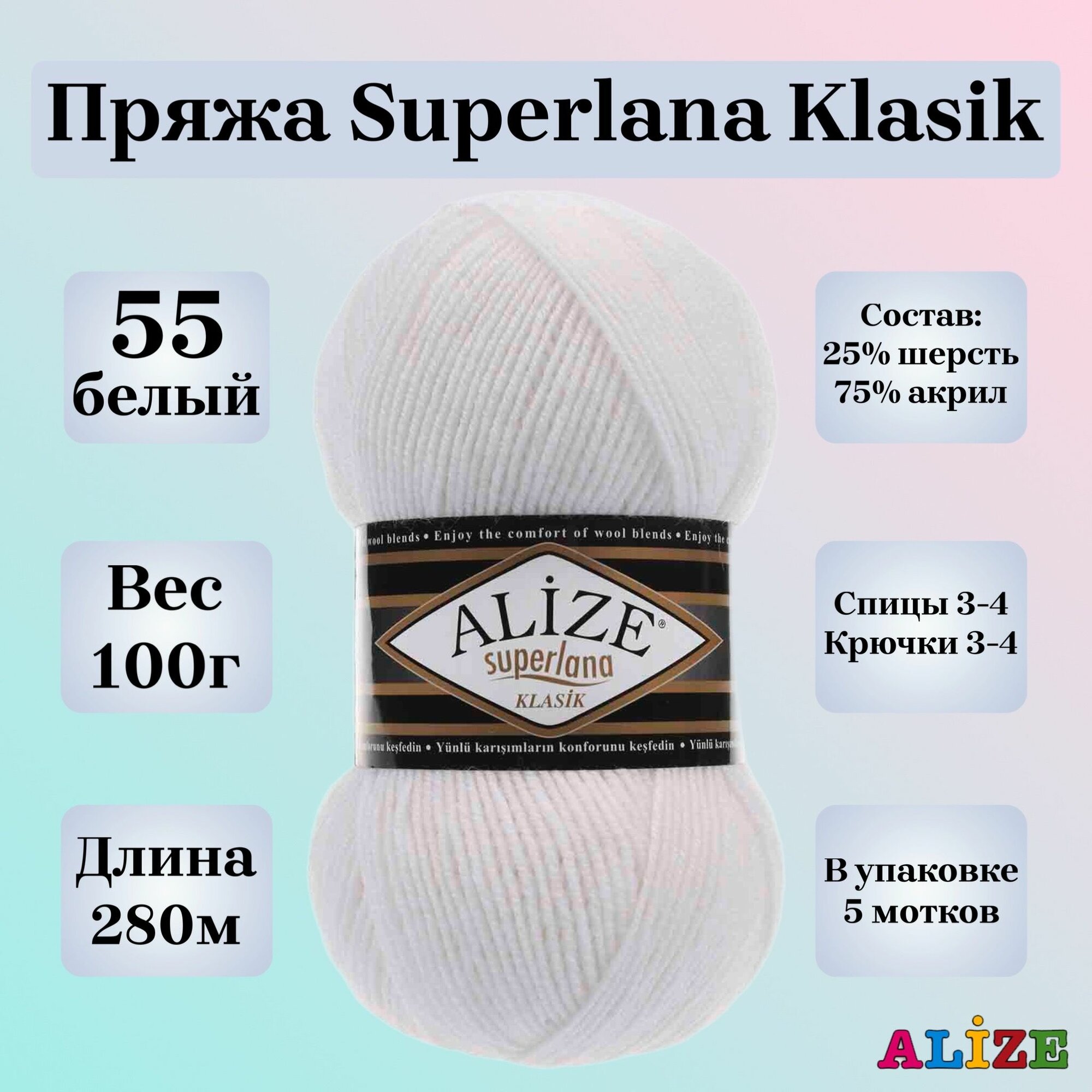 Купить Пряжа для вязания Alize Superlana Klasik, цвет 55 белый, 100г, 280м, 5шт/упак с доставкой по всей России. Пряжа для вязания Alize Superlana Klasik, цвет 55 белый, 100г, 280м, 5шт/упак: сравнение цен, характеристики, фото, актуальное наличие и цены.