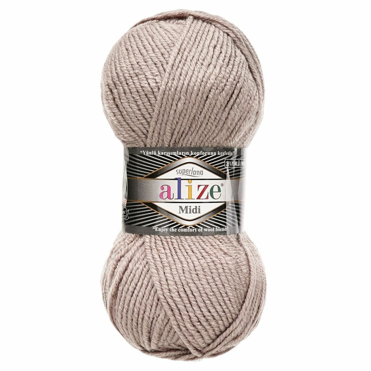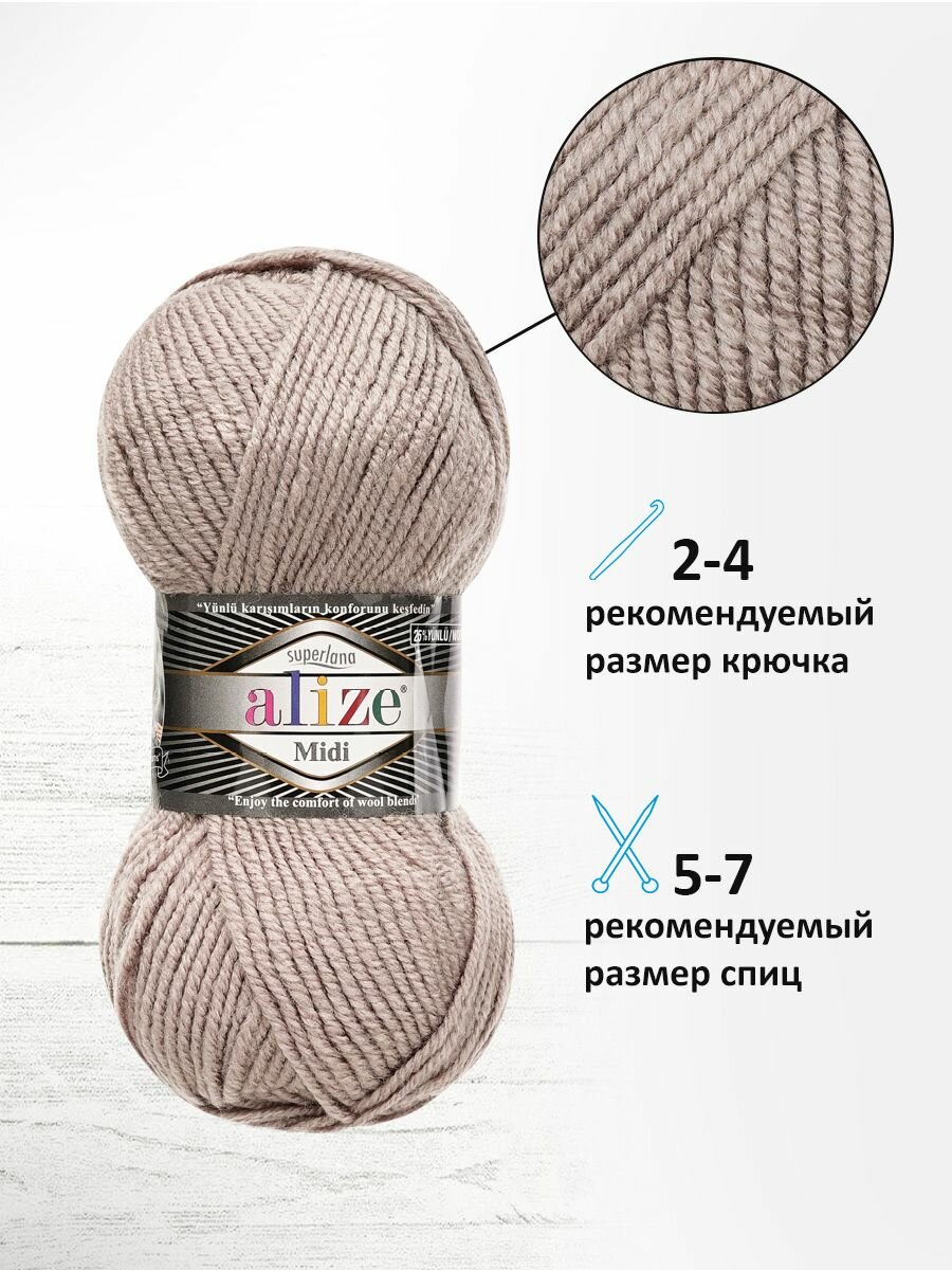 SUPERLANA MIDI – пряжа средней толщины с классическим типом крутки. Отличается тщательно подобранной цветовой гаммой: нежные приглушенные оттенки, яркие цвета, а также меланжевые расцветки. Такое разнообразие цветов заинтересует даже взыскательных мастериц. Благодаря оптимальному содержанию шерсти пряжа SUPERLANA отлично согревает и идеальна для вещей на холодную весну и позднюю осень. Акрил придает вязаному полотну практичность, мягкость, устойчивость к износу. Пряжа подойдет для различных проектов, свяжите из нее модный шарфик или шапку, объемный свитер, платье или уютный плед. Инструменты: спицы №5-6, крючок №2-4. Состав: 25% шерсть, 75% акрил. Размер: 100 г, 170 м.