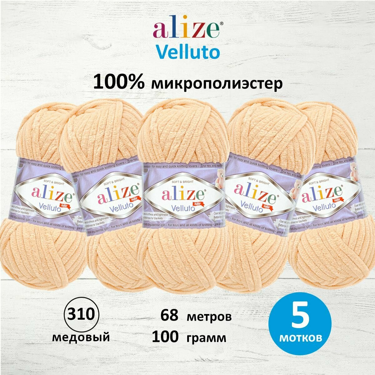 Пряжа для вязания ALIZE ‘Velluto’, 100г, 68м (100% микрополиэстер) (310 медовый), 5 мотков: сравнение цен, характеристики, фото, актуальное наличие и цены.