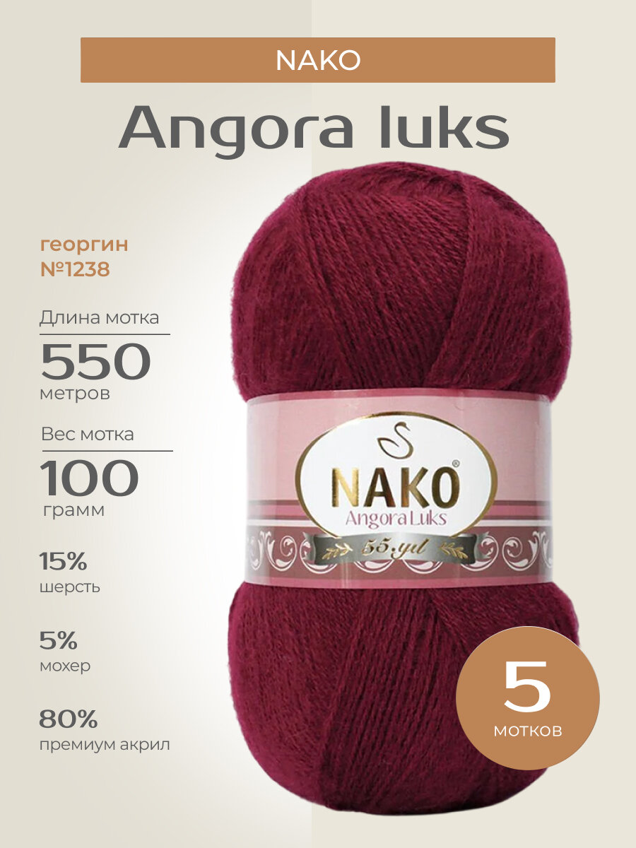 Пряжа для вязания спицами, крючком NAKO Нако «Angora luks (Ангора Люкс)» тонкая, шерсть мохер премиум акрил, цвет: 1238 Георгин, 5 шт. по 100 г, 550 м: сравнение цен, характеристики, фото, актуальное наличие и цены.