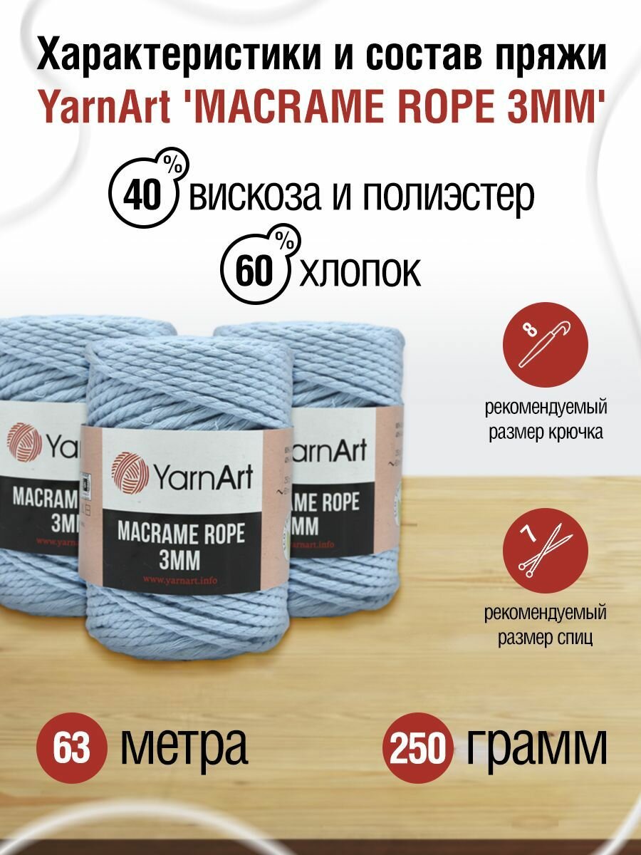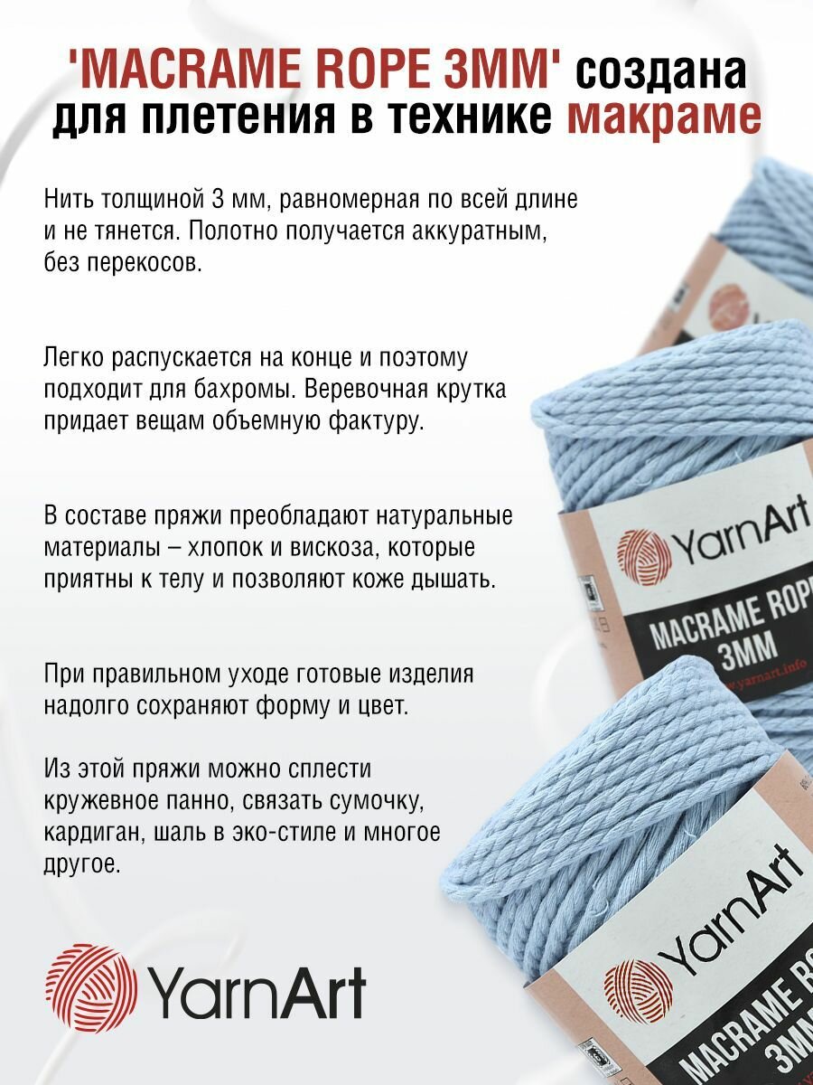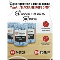 Пряжа для вязания YarnArt ‘Macrame Rope 3мм’ 250г, 63м (хлопок, вискоза, полиэстер) (760 небесно-голубой), 4 мотка: сравнение цен, характеристики, фото, актуальное наличие и цены.