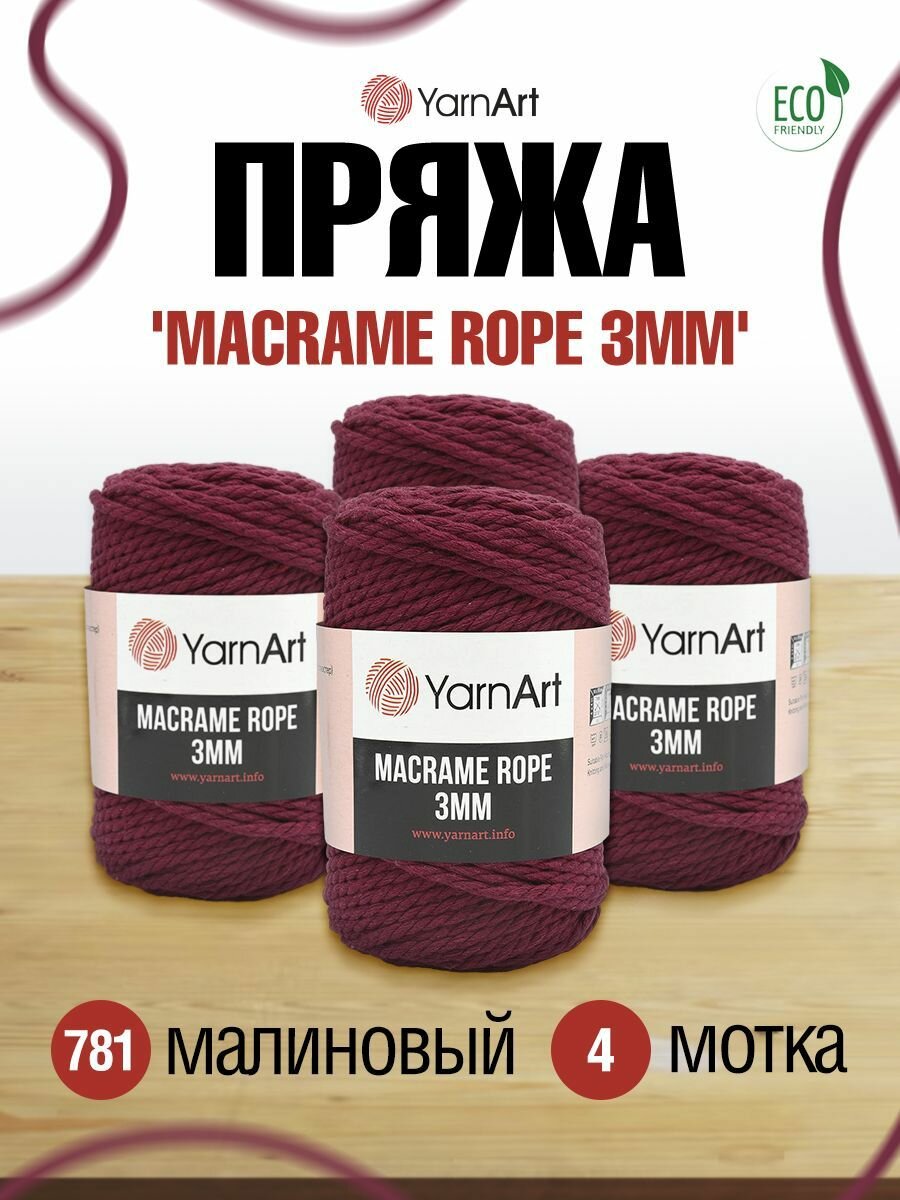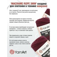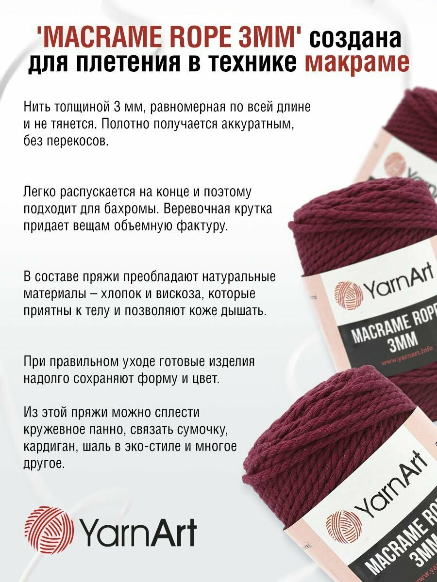 Macrame Rope' – пряжа для создания ажурных поделок в технике макраме. Подходит также для вязания спицами. Пряжа-веревка толщиной 3 мм с выраженной круткой придает готовым вещам интересную фатуру. Из этой пряжи можно вязать оригинальные кардиганы, шали, шарфы. Представлена в широкой цветовой палитре. В составе преобладают натуральные материалы – хлопок и вискоза, поэтому изделия из этой пряжи приятны к телу, позволяют коже дышать и не перегревают.