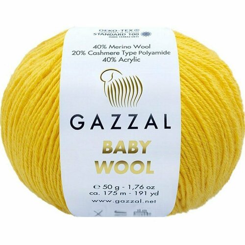 Пряжа для вязания Газзал Беби вул (Gazzal Baby wool), 40% меринос - 40% акрил - 20% кашемир ПА, 50 гр * 175 м, в упаковке 5 мотков одного цвета. Рекомендуемый размер спиц/крючка 3 мм. Мягкая, упругая нить, не колется, подходит для малышей. В полотне стабильная, хорошо держит косы, араны, приятна к телу, хорошо переносит деликатную машинную стирку, не деформируется.