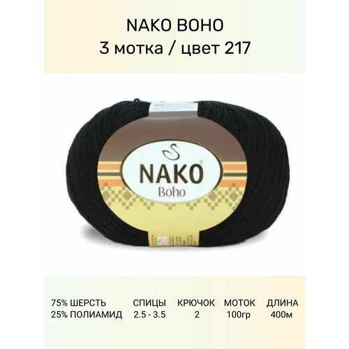 Пряжа Nako Boho Нако Бохо: 217 (черный), 3 шт 400 м 100 г, 75% шерсть, 25% полиамид
