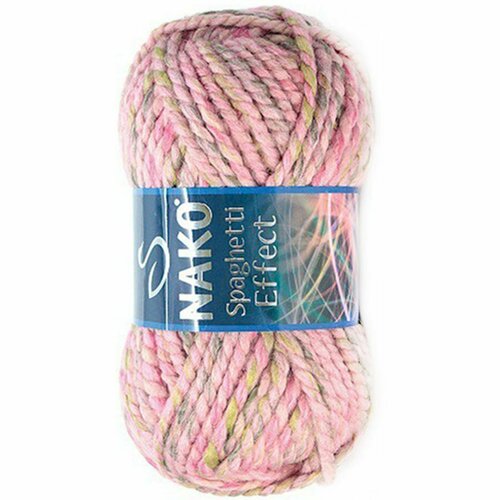 Пряжа для вязания Нако Спагетти эффект (Nako Spaghetti effect), 25% шерсть - 75% акрил, 100 гр * 60 м, в упаковке 5 мотков одного цвета. Рекомендуемые спицы/крючок 6-8 мм. Толстая, полушерстяная пряжа. Нить мягкая, износоустойчивая, отлично держит форму в изделии и хорошо ложиться при вязании. Отлично смотрится в рельефных узорах. Подойдет для объемных снудов, шапок, кардиганов, верхней одежды.