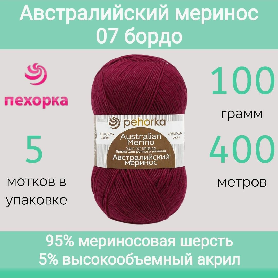 Купить Пряжа Пехорка Австралийский меринос цвет 07 бордо (100г/400м, упаковка 5 мотков) с доставкой по всей России.