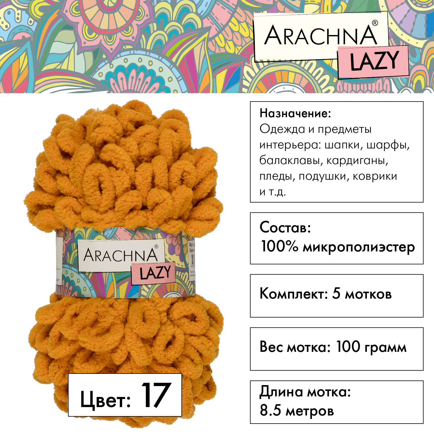 Пряжа плюшевая ARACHNA «LAZY» 5 шт. х 100 г 8.5 м 100% микрополиэстер №17 горчичный: сравнение цен, характеристики, фото, актуальное наличие и цены.