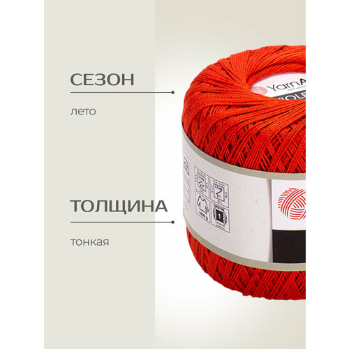 Классическая турецкая пряжа на 100% состоит из натурального мерсеризованного хлопка. Нить отлично скрученная и необычайно тонкая. Мерсеризация нити позволяет сделать пряжу более прочной, цветоустойчивой, придает легкий блеск. Рекомендуется эта пряжа для вязания в технике «ирландское кружево», отлично подходит и для сложных композиций, состоящих из жгутов, кос, плетёнок и тому подобных объёмных узоров. Подходит для вязания на спицах и крючком. Из неё чаще всего вяжут лёгкие ажурные вещи для лета. Для свитера (пуловера) размера S ориентировочно потребуется 250 г пряжи, размера М - 300 г пряжи, размера L - 350 г пряжи.