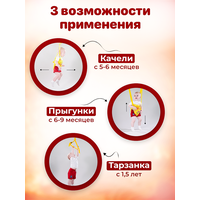 В районе годика ребенок начнет хвататься за верхнюю перекладину подвесного комплекса и пытаться подтянуться, а с полутора до трех лет сможет свободно висеть на ней без сторонней поддержки. Тогда можно отстегнуть штанишки от перекладины, потуже затянуть эспандерный шнур на пружине и использовать прыгунок как тарзанку.