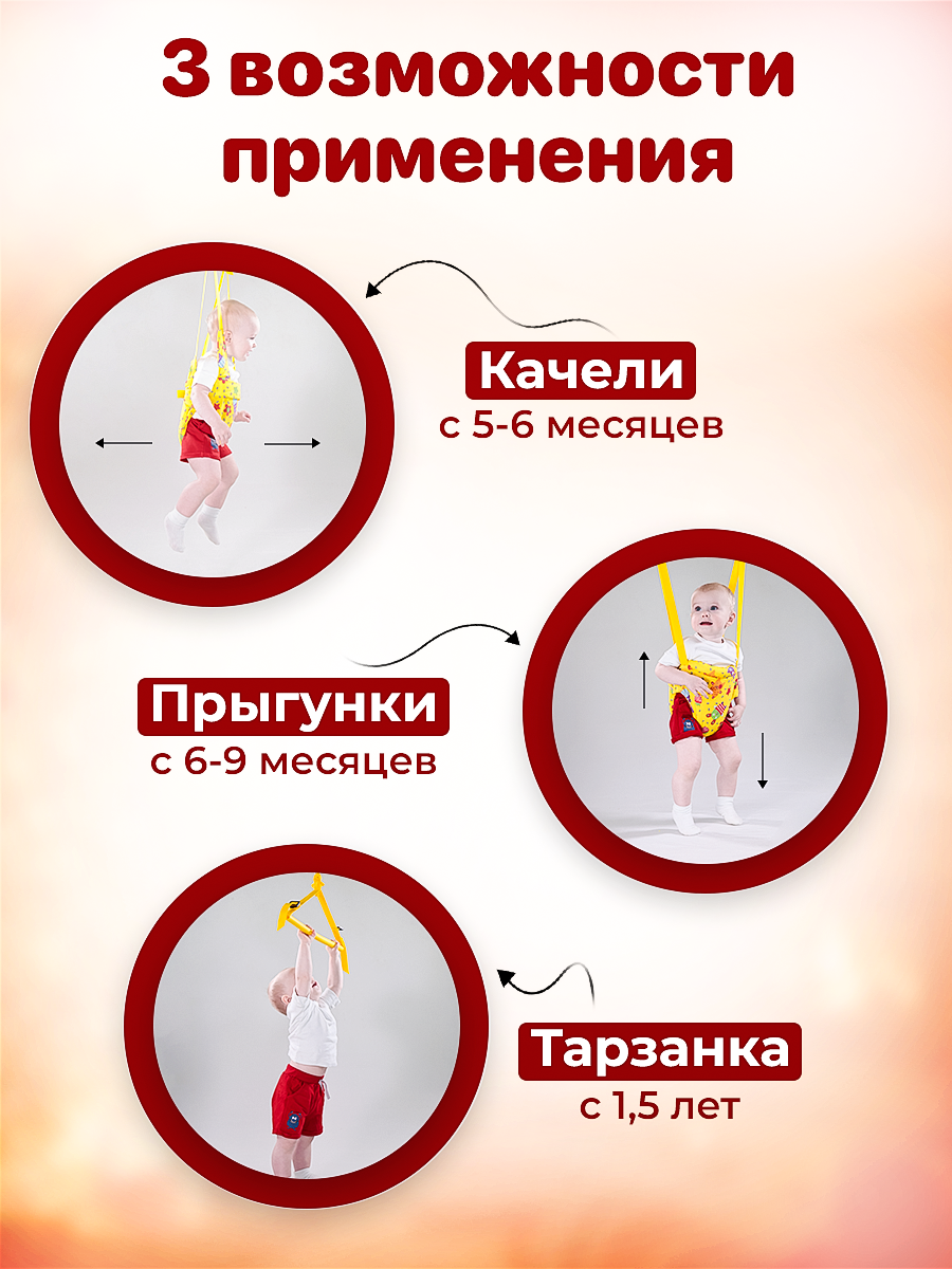 Можно использовать с 6 месяцев как качели для самых маленьких. Отрегулируйте высоту изделия таким образом, чтобы ребенок не касался ногами пола и туго затяните эспандерный шнур на пружине. Качель готова к использованию, осталось посадить ребенка и начать раскачивать.