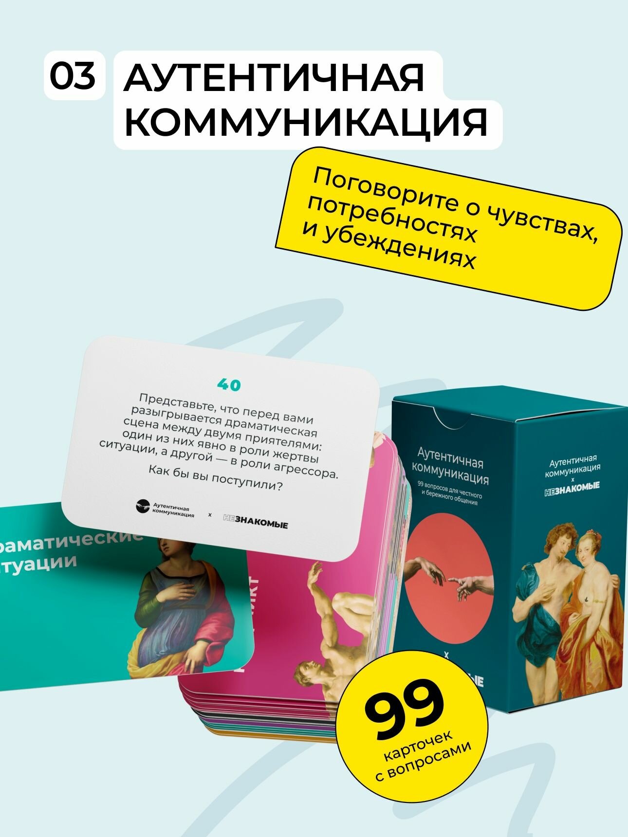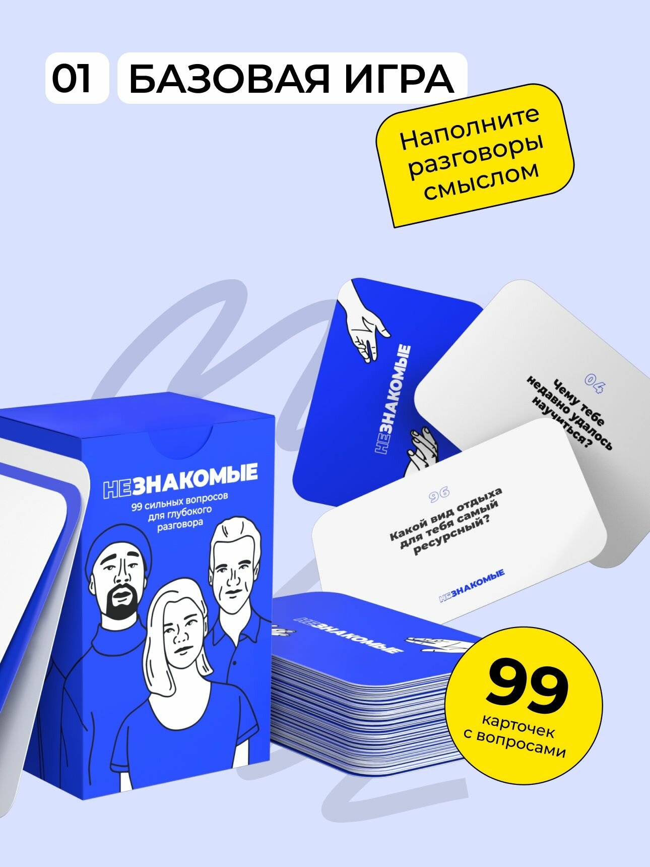 При этом задавать правильные вопросы бывает совсем не просто. То момент неподходящий, то нужные слова не находятся. А порой банально боишься, что тебя не поймут и не захотят продолжать общаться. Серия коммуникационных игр «Незнакомые» помогает устранить эти сложности: сломать лед в общении, найти темы для глубоких содержательных бесед и стать ближе с собеседниками. Выбирайте подходящую игру, исходя из своих предпочтений и задач.