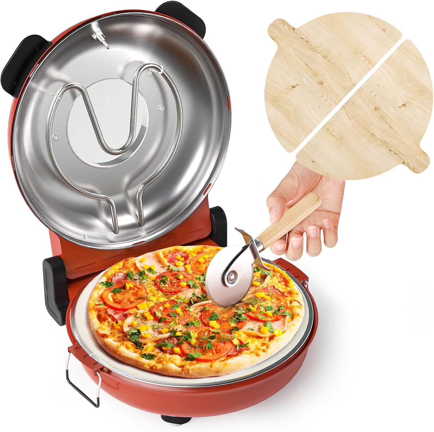 PSQL35D 12-дюймовая электрическая печь для пиццы Red pizza machine портативная настольная машина для пиццы мощностью 1500 Вт, печь для пиццы с вытяжным охлаждением, печь для пиццы при температуре 420 ℃, 4-минутная печь для пиццы из керамического камня,