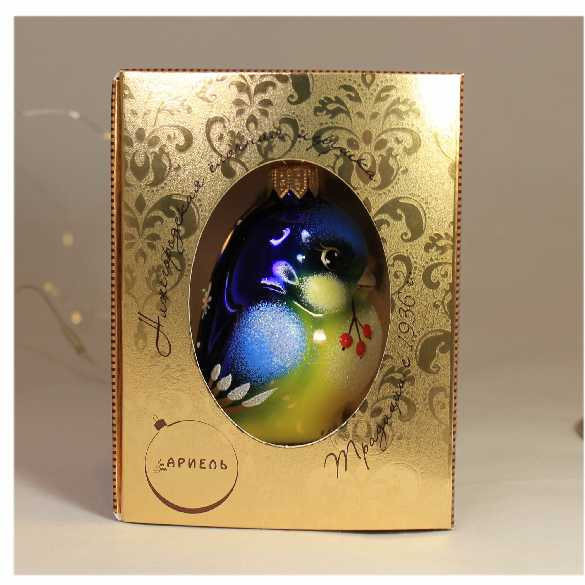 Коллекционная стеклянная елочная игрушка от фабрики стеклянных ёлочных украшений Ариель. Елочная игрушка из стекла с ручной росписью. Продается в индивидуальной красивой упаковке. Станет идеальным подарком и достойным украшением любой Новогодней елки. Фабрика Ариель имеет статус предприятия народных художественных промыслов. Стеклодувы и художники фабрики не только сохранили старинные традиции, но и подарили нижегородской ёлочной игрушке новую жизнь, прославив её на весь мир. Мастера фабрики, вдохновляясь русскими сказками и народными костюмами, создают живых и обаятельных персонажей, каждый из них - настоящий красочный мир, выдутый и расписанный с любовью.