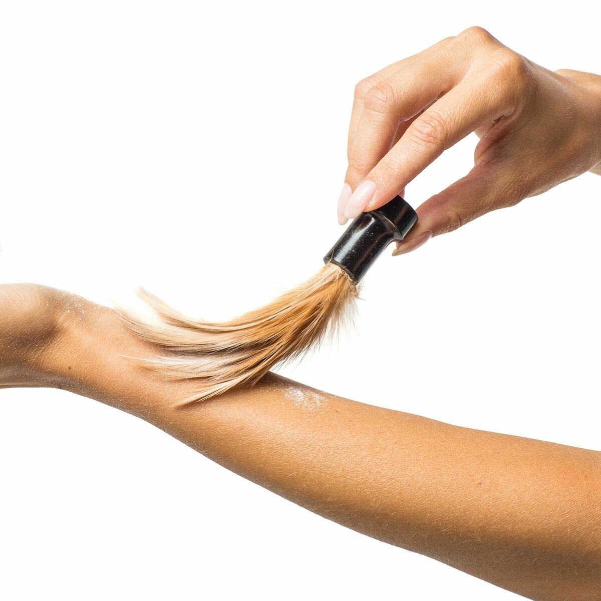 Нанесите пудру на тело с помощью приложенной кисти с перьями. Используйте как сухой шампунь, втирая в корни волос. Перед применением стряхните излишки пыли.