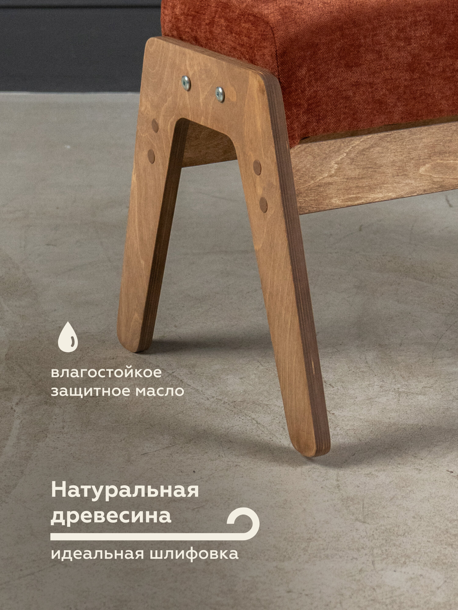 Березовый каркас обеспечивает прочность и долговечность пуфа. Серый велюр обивки приятен на ощупь и прост в уходе.