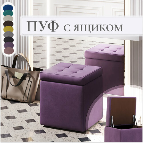 Пуф, банкетка, с ящиком для хранения, открывной, с механизмом «Мечта», фиолетовый, микровелюр, мягкий, квадратный, 40x40x43, в гостинную, в прихожую, в спальню, в коридор, подставка под ноги, к креслу: сравнение цен, характеристики, фото, актуальное наличие и цены.