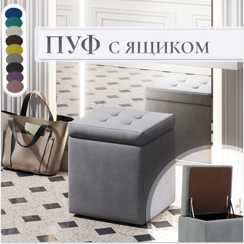 Пуф, банкетка, с ящиком для хранения, открывной, с механизмом «Мечта», серый, микровелюр, мягкий, квадратный, 40x40x43, в гостинную, в прихожую, в спальню, в коридор, подставка под ноги, к креслу: сравнение цен, характеристики, фото, актуальное наличие и цены.