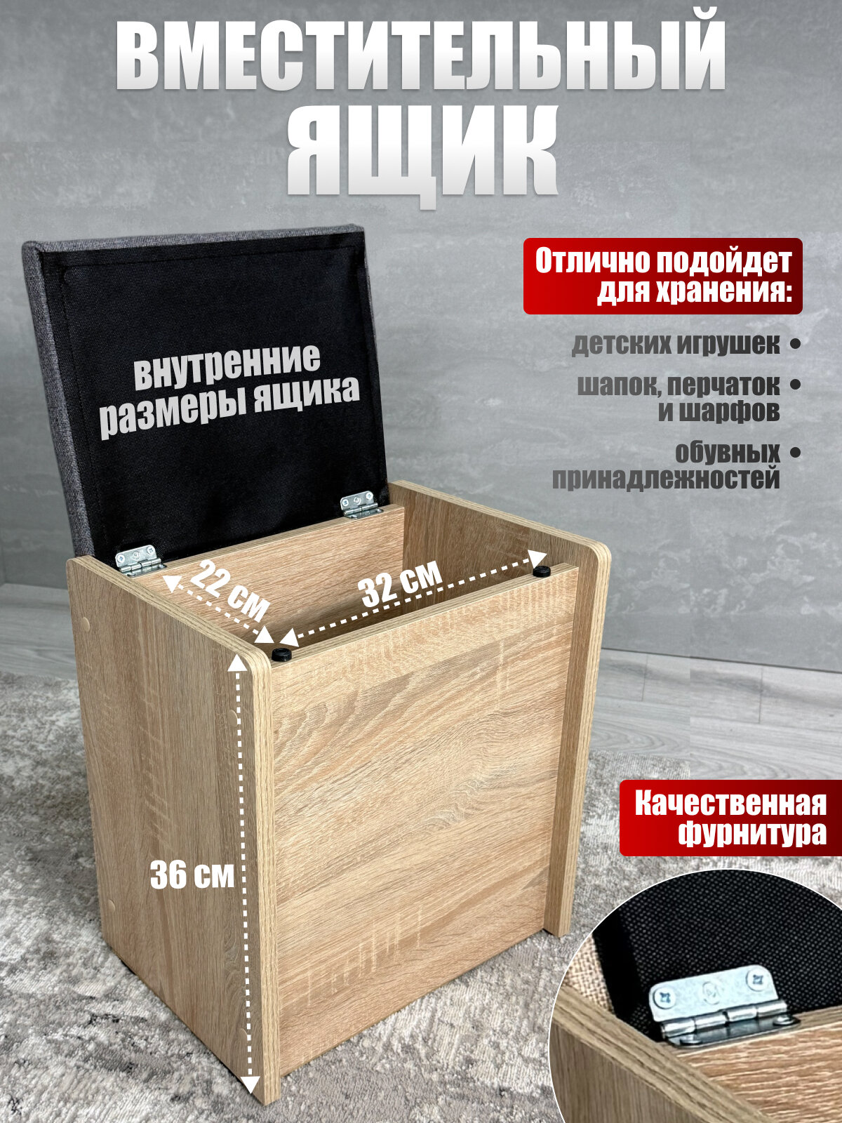 Одной из особенностей пуфа является наличие ящика для хранения. Внутренний размер ящика составляет 32х22х36 см, что позволяет удобно размещать обувь, аксессуары или различные мелочи, поддерживая порядок в вашем доме.