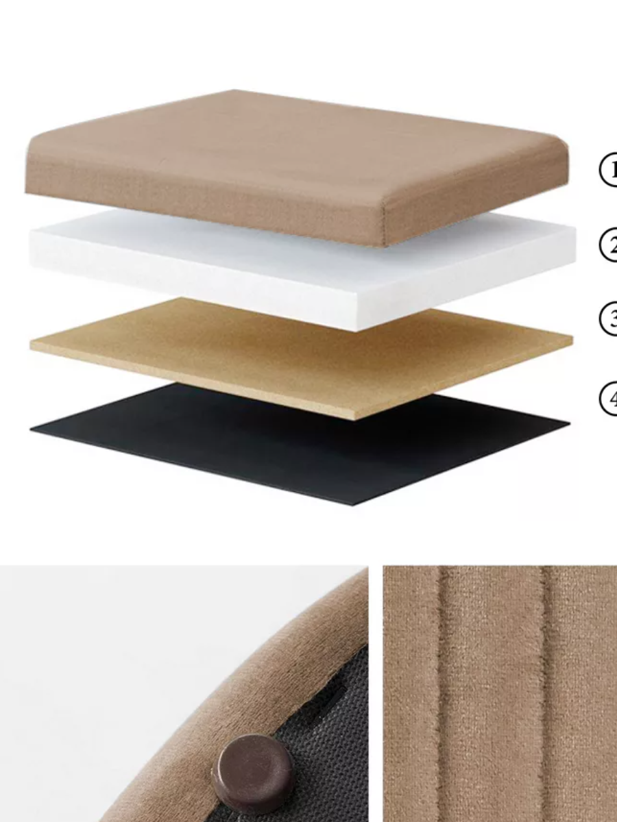 Материал каркаса пуфа - ДСП, массив дерева или металл, что гарантирует его прочность и долговечность. Обивка выполнена из флока, велюра или микровелюра, обеспечивая мягкость и комфорт при использовании.