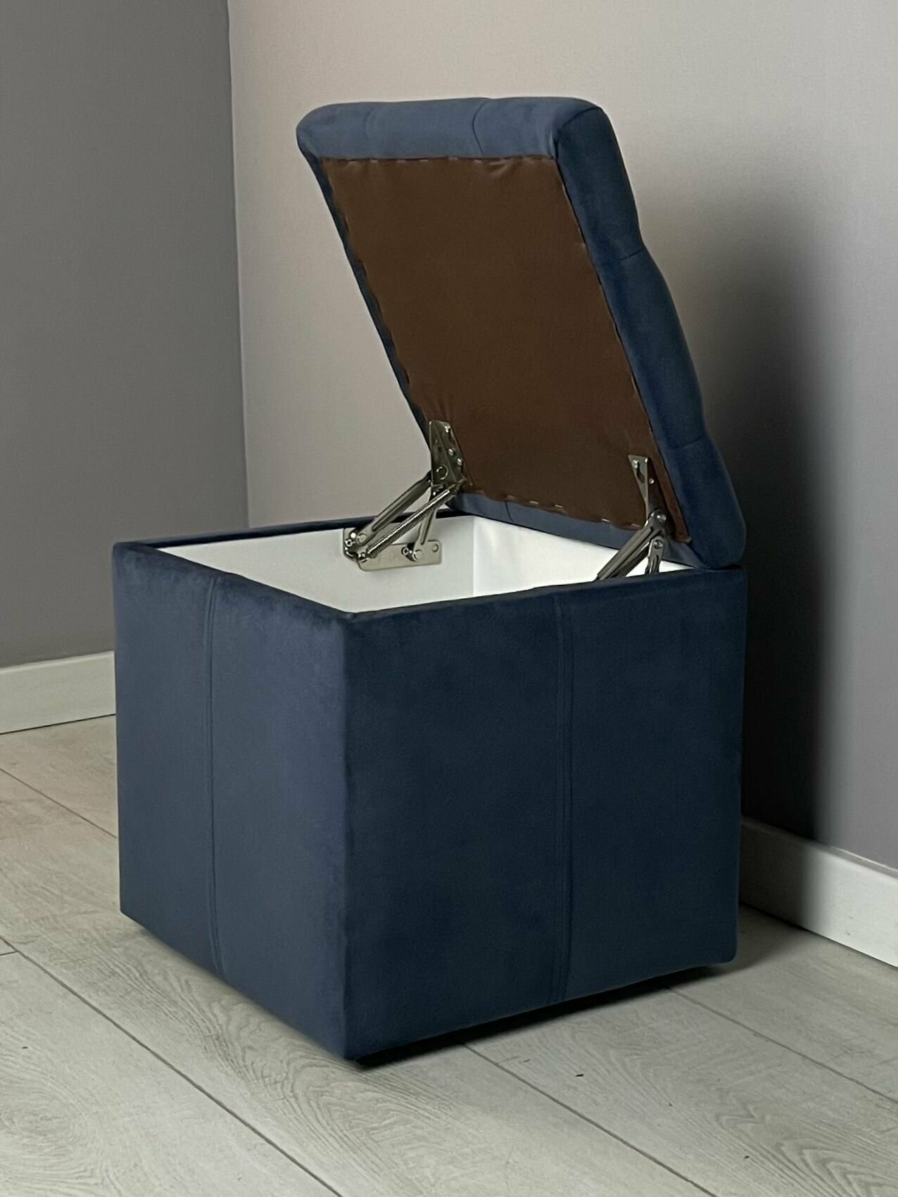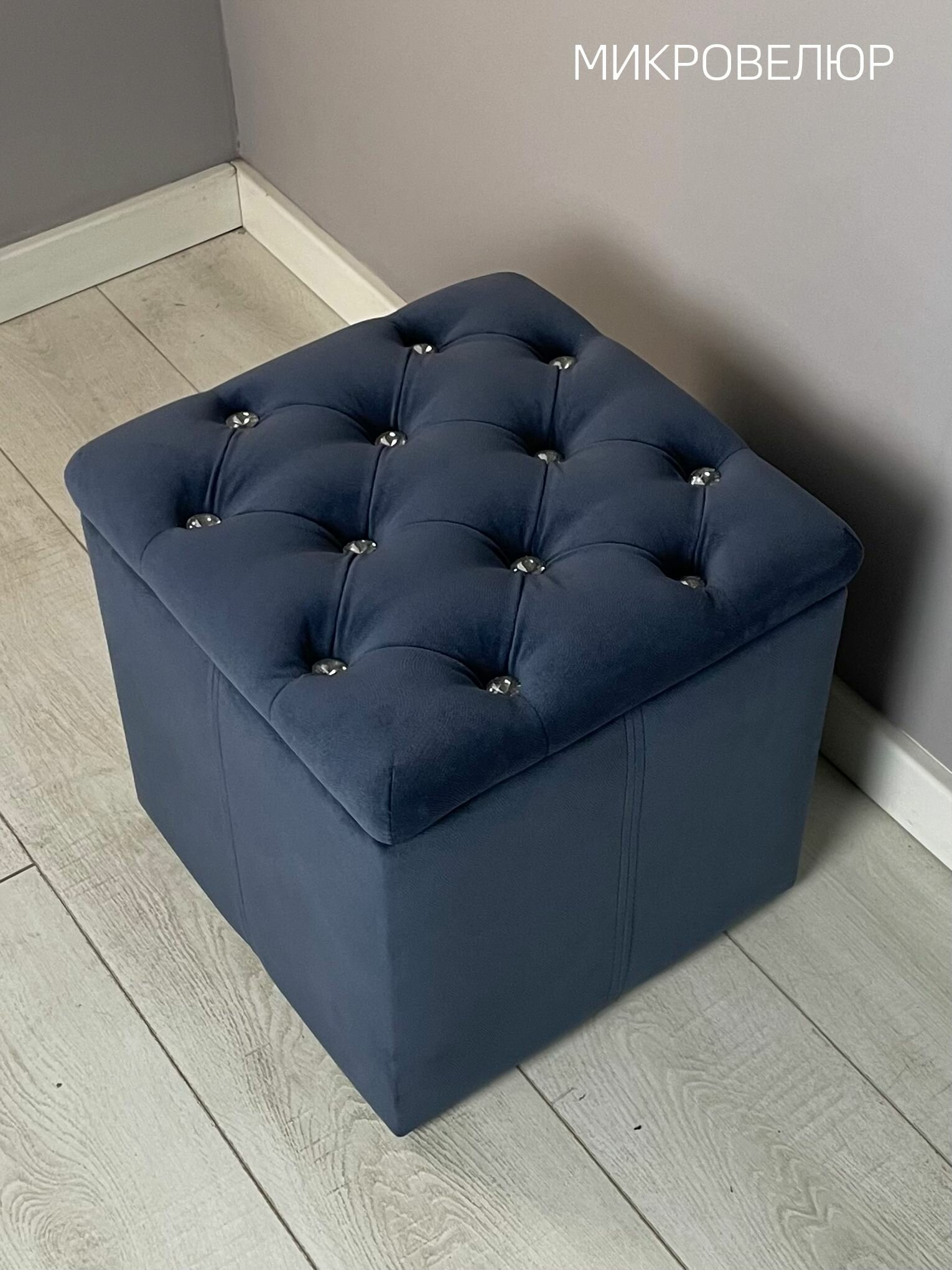 Пуф амалия люкс (Стразы, Ткань Микровелюр) пуфик с каретной стяжкой открывающийся) идеально подойдет в Вашу прихожую, гостиную или спальню. Вам понравится, насколько изменится Ваша комната с этой очаровательной банкеткой. Чехол обивки из качественной ткани Микровелюр. Размеры банкетки (пуфика): длина 38 см , ширина 38 см , высота 39 см . Она поставляется в собранном виде и упакована в гофрокартон. Банкетка в прихожую имеет большой короб с внутренними размерами: длина 32 см, ширина 32 см, глубина 29 см. Выдерживает нагрузку до 150 кг. Сиденье оформлено каретной стяжкой и изящными стеклянными стразами. Под крышкой (сиденьем) находится большой ящик для хранения. Крышка закреплена надежными антресольными петлями с пружинами, которые обеспечивают плавное открывание и закрывание, а также удерживают сидение в открытом положении. Коробка корпуса изготовлена из толстого ламинированного ДСП 16 мм. Мягкий ППУ (пенополиуретан) на боковинах делает их комфортными, не жесткими и создает вместе с декоративными строчками визуальную рельефность. На мебель снизу установлены надежные пластиковые черные ножки, которые обеспечивают устойчивость и не царапают пол. Пуфики имеет конструкцию корпуса, которая позволяет, при желании Покупателя, установить снизу на дно любые варианты ножек. Тем самым Вы можете увеличить банкетку по высоте, дополнительно сделать акцент на стиле комнаты (современный, модерн, классический и т. д.) Пуфики для прихожей и мягкие вешалки фиессо (из нашего ассортимента мебели) - прекрасный комплект для коридора. Пуфы с ящиком удобны в прихожей для хранения обуви (обувница) и других вещей. Прихожая, в которой будут наши банкетка с местом для хранения и вешалка в ткани из велюра (или кожзам в качестве обивки), станет украшением Вашего дома. Пуф прямоугольный в детскую можно использовать для хранения игрушек. Пуфы и банкетки для гостиной и в зал создадут дополнительные места для сидения и хранения. Банкетка для спальни дополнит кровать и станет местом, куда удобно будет убирать покрывало, накидки и другие постельные принадлежности (займется их хранением). Её можно поставить у туалетного столика. К туалетному столику отлично подойдут пуфы из нашей коллекции, как с маленькими неприметными черными пластиковыми опорами, так и с высокими деревянными резными ножками (белыми или венге). Для кухни идеальным вариантом будут банкетки с глубокими ящиками под сидением. Высококачественная искусственная кожа Экотекс с полиуретановым покрытием обладает высокой устойчивостью к многократному изгибу, истираемости, имеет хорошие гигиенические и эксплуатационные свойства. Велюровая обивка выполнена из ткани коллекции Мазерати, которая предоставит возможность насладиться классической роскошью и элегантностью, почувствовать максимум комфорта и удовольствия. Эта ткань прекрасно чистится, поэтому для Вас даже белые пуфик из ткани и вешалка в прихожку не будут проблемными в эксплуатации. Синий и розовый велюровый тканевый материал добавит эксклюзивности в ваш интерьер. Обивка из серого микровелюра отлично подходит для прихожей. Этот классический немаркий цвет придает ей неброскую элегантность, изысканную умиротворенность. Одним словом - классика. Банкетки и пуфики являются отличным решением для подарка своим родным и близким на день рождения, юби