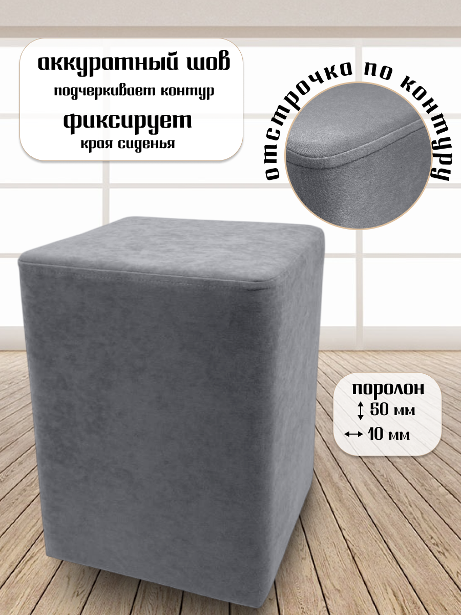 Каркас пуфа имеет покрытие из пенополиуретана - это мебельный поролон, который придает мягкость изделию, имеет амортизирующее свойство и прекрасно держит форму. Сбоку толщина поролона составляет 10 мм. Сверху 50 мм. Края скругленные, с ровной отстрочкой, которая подчеркивает контуры, фиксирует и гарантирует стабильность сиденья. У пуфа нет острых углов, что обеспечивает безопасность при эксплуатации, а также подчеркивает безупречность исполнения.